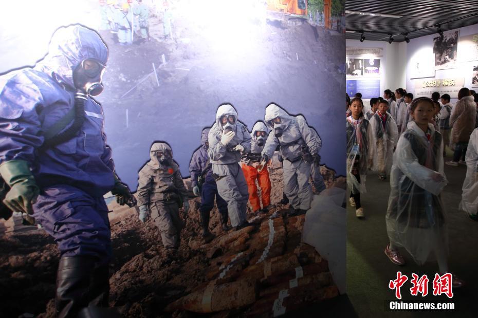 10月20日,由外交部处理日本遗弃在华化学武器问题办公室和国防部处理日本遗弃化学武器办公室联合主办,侵华日军南京大屠杀遇难同胞纪念馆承办,江苏省人民政府外事办公室协办的《还人民一片净土——处理日本遗弃在华化学武器工作纪实展》在南京开幕。本次展览共展示了700多幅图片、70余件文物、300多枚复制化学弹模型,并通过幻影呈像、场景复原等多种现代化手段,全面揭露了侵华日军使用化学武器的罪行,展现了参与处理日遗化武工作人员不畏艰险、无私奉献,力争早日还人民一片净土的决心。图为展出的侵华日军用防毒手套(上)、侵华日军用防化鞋(下左)、侵华日军九六式轻防毒面具(下右)。
