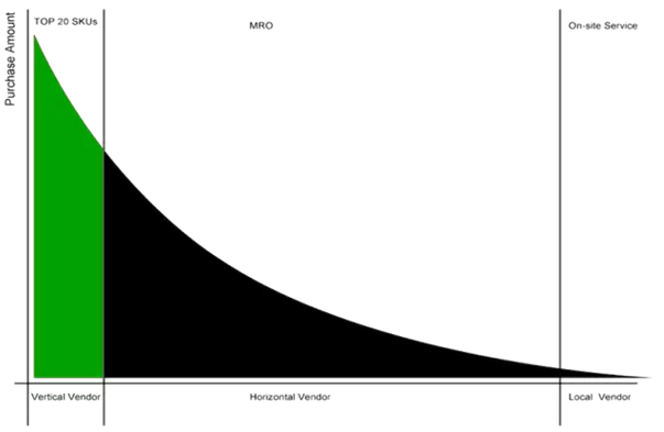 在MRO行业中,有一条著名的长尾曲线:横轴表示客户购买过的各种产品,每个点代表一个型号;纵轴表示每个产品对应的采购量。