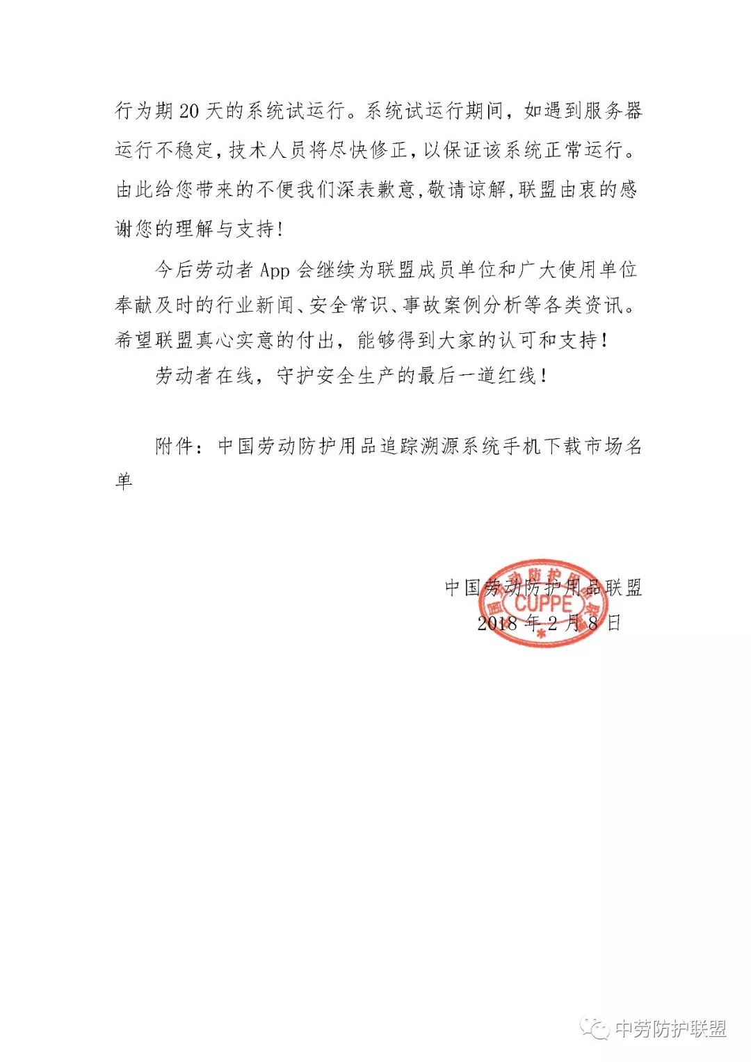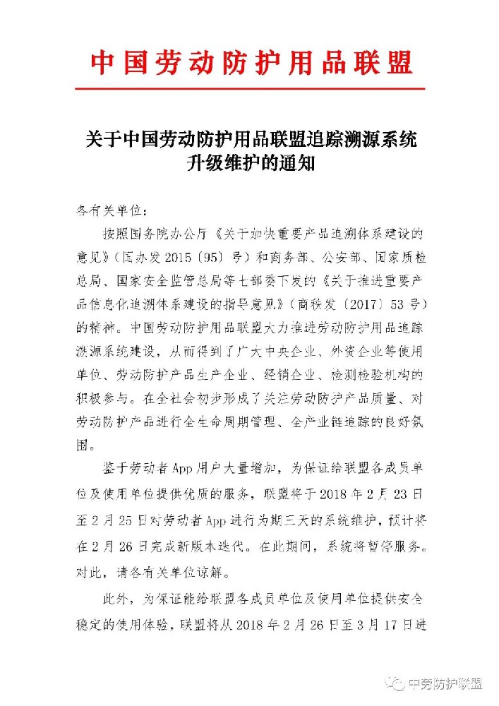【通知】关于中国劳动防护用品联盟追踪溯源系统升级维护的通知