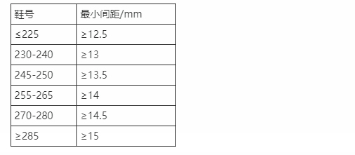 耐压力性能:安全鞋在(15±0.1)千牛压力下,保护包头内最小间距符合下表要求