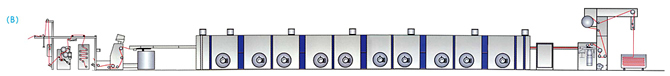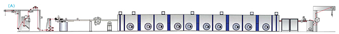 平幅进布->红外对中->二辊斜轧车->气动松紧->四辊整纬->下超喂->机械整纬->扩幅->上超喂->红外线探边->三指剥边、平板剥边->毛刷轮超喂->上针板->加长轨道->进烘房定形->出烘房喷冷风->张力调整->小卷装和摆幅落布
