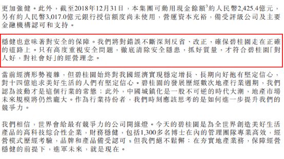 “稳健也意味着对安全的保障。我们将对错误不断深刻反省、改正,确保碧桂园走在正确的道路上。只有高度重视安全问题,彻底清除安全隐患,抓好质量,才符合碧桂园‘对人好,对社会好’的经营理念。”碧桂园在2018年报中表示。