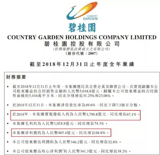 经营业绩方面,碧桂园2018年全年营收3790.8亿元人民币,同比增长67.1%;毛利1024.8亿元,同比增长74.3%;净利润485.4亿元,同比增长68.8%;归属于股东应占净利润346.2亿元,同比增长32.8%。