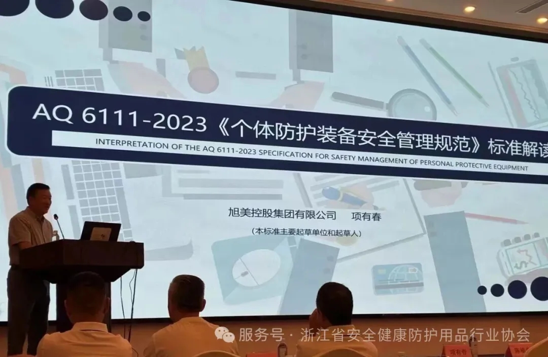 副会长、旭美控股集团有限公司总经理项有春作为标准主要起草单位和起草人受邀对《个体防护装备安全管理规范》(AQ6111-2023)行业标准进行了深入解读,为与会代表提供了宝贵的专业指导,助力企业提升安全管理和产品质量水平。