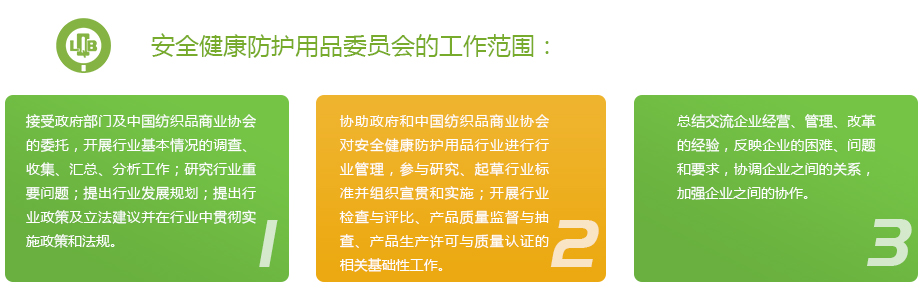 安全健康防护用品委员会(原劳保专业委员会)是中国纺织品商业协会下设的分支机构。根据“中国纺织品商业协会章程”、“专业委员会工作条例”、“专业委员会工作条例补充规定”所确定的宗旨、业务范围、工作程序以及中国纺织品商业协会的授权开展活动、发展会员,委员会的日常工作是接受中国纺织品商业协会秘书处的领导。